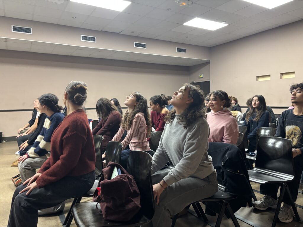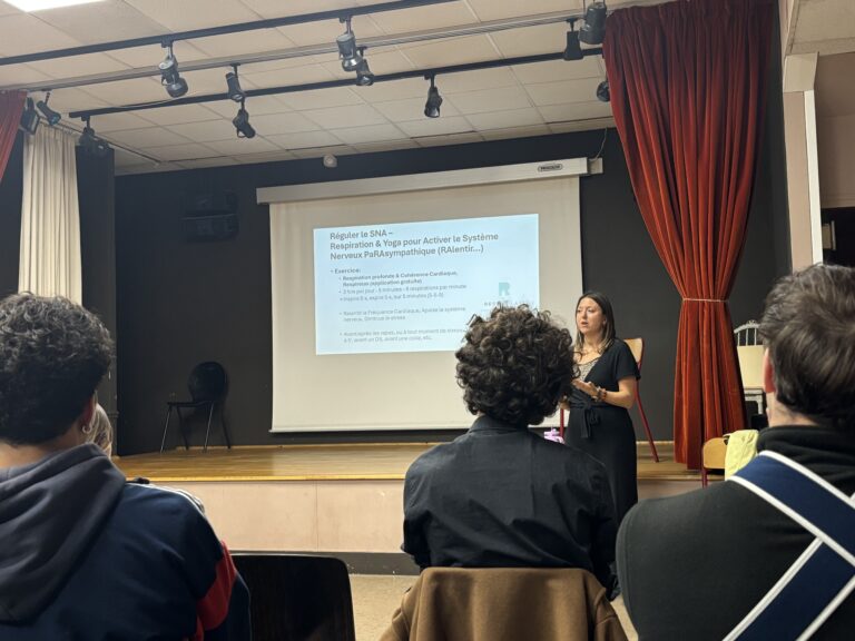 Parallèlement, Marine Huard a également découvert le yoga et choisi d’enseigner cette pratique. Elle a montré combien les bénéfices de cette discipline avaient été précieux dans son parcours et donné aux étudiant•es quelques ressources pour se détendre, quand ils travaillent chez eux ou même en DS.